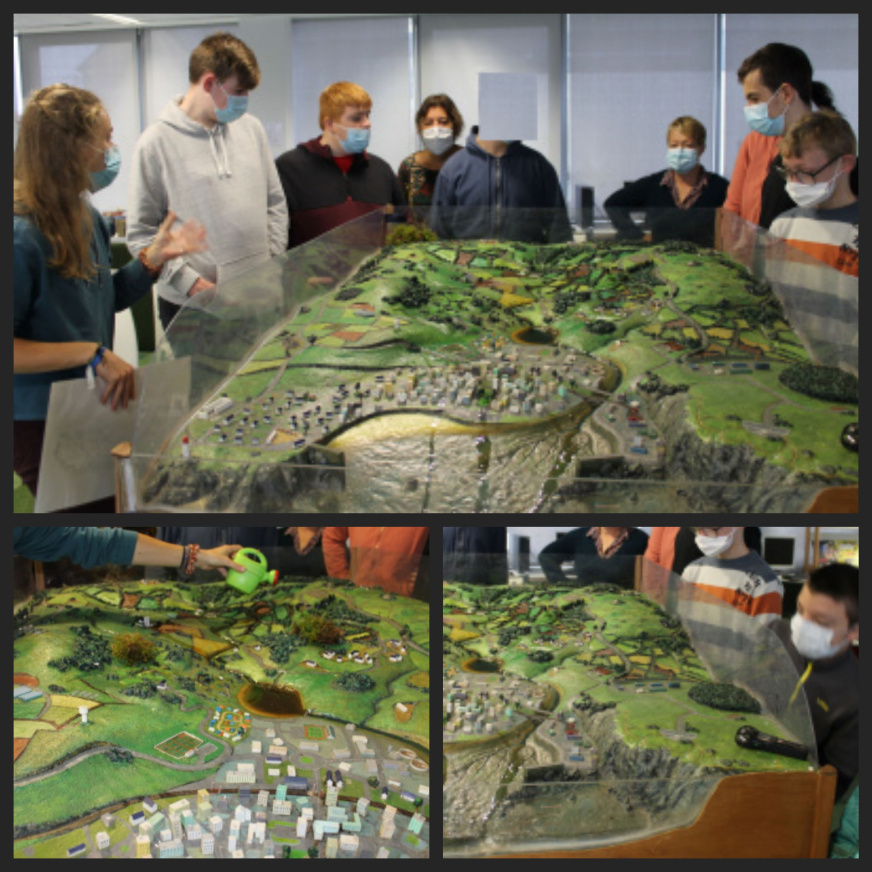 Elle a présenté le rôle des zones humides qui fonctionnent comme des éponges dans la nature. Sur une grande maquette de bassin versant qu’elle avait apportée, elle a versé de l’eau avec un petit arrosoir pour bien expliquer où l’eau coule.