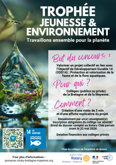 Les établissements s’inscrivent sur ADAGE. Les productions devront être envoyées avant le 22 mai 2026. Le dossier complet (vidéo et affiche) devra être adressé pour le 22 mai 2026 au représentant du club Rotary local ainsi qu’au conseiller CSTI-EDD de la DRAEAC Bretagne, Julien Bouzéloc, à l’adresse suivante : julien.bouzeloc chez ac-rennes.fr (via l’application FileSender disponible sur TOUTATICE) en vue d’une publication académique. Certains projets seront récompensés par le Rotary International (aide au financement du projet ou acquisition de matériel en lien avec le projet). La remise des prix est prévue le 14 juin 2026 à Cesson-Cévigné.