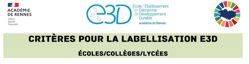 Le label « E3D École/Établissement en démarche de développement durable » est attribué aux écoles, aux collèges et aux lycées généraux, technologiques et professionnels, ainsi qu’aux centres de formation d’apprentis qui entrent en démarche globale de développement durable.