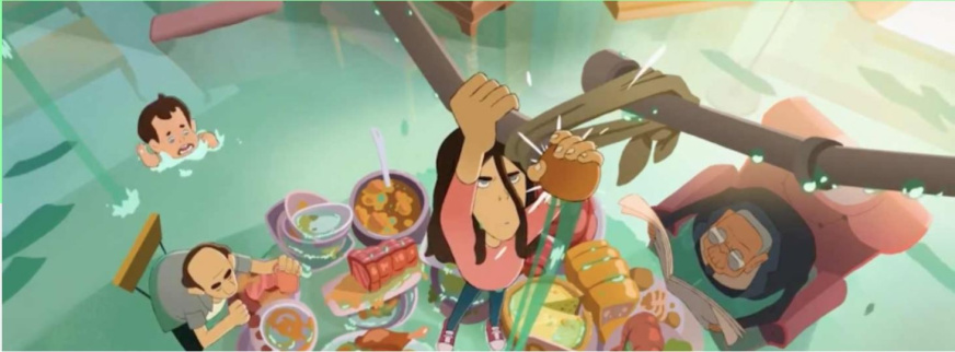 Film d’animation Thermostat 6. Une jeune fille essaye, en vain, d’alerter sa famille d’un problème de fuite d’eau … un peu urgent. Comme vous l’aurez compris, le reste de sa famille est alors une métaphore du reste de la population, insouciante et qui continue de vivre sa vie comme si de rien n’était. Ils observent, sans agir, et repoussent l’action au lendemain ; alors qu’ils subissent déjà les conséquences de ce changement.
