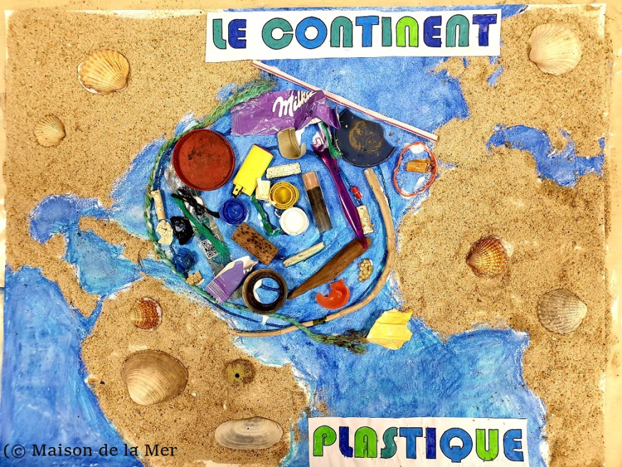 Après une sortie découverte de la biodiversité littorale, un atelier« Tout finit à la mer ! » sur les pollutions, et plus particulièrement la pollution plastique en me,r a été réalisé par les élèves . Durant la sortie les élèves ont ramassé des déchets trouvés sur la plage, ils en ont aussi ramené de leurs balades avec leurs parents et l’enseignante a choisi de représenter un continent de plastique à partir de ces déchets. Un médiateur l’a ainsi accompagné dans cette démarche.