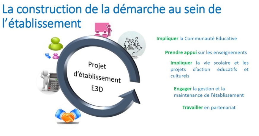 S’appuyant sur des approches transversales, la démarche « E3D » intègre les enseignements, ainsi que la diversité de projets possibles permettant de vivre l’établissement comme un lieu d’apprentissage global du développement durable, ancré dans son territoire.