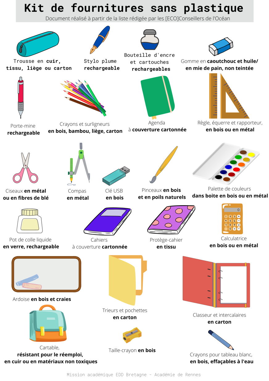 A l’heure de cette nouvelle rentrée scolaire 2022-2023, nous vous proposons de consulter le « Kit de fournitures sans plastiques » réalisé par les élèves du lycée de l’Harteloire (Brest), [ECO]conseillers de l’Océan et lauréat des Trophées Bretons du Développement Durable 2022. Cette proposition née d’une réflexion menée conjointement avec le collège Châteaubriand de St Malo dans le cadre du projet académique des [ECO]conseillers de l’Océan. Le Kit a été présenté au Ministre de l’Education nationale, de la Jeunesse et des Sports lors du One Ocean Summit qui s’est tenu à Brest en février 2022.